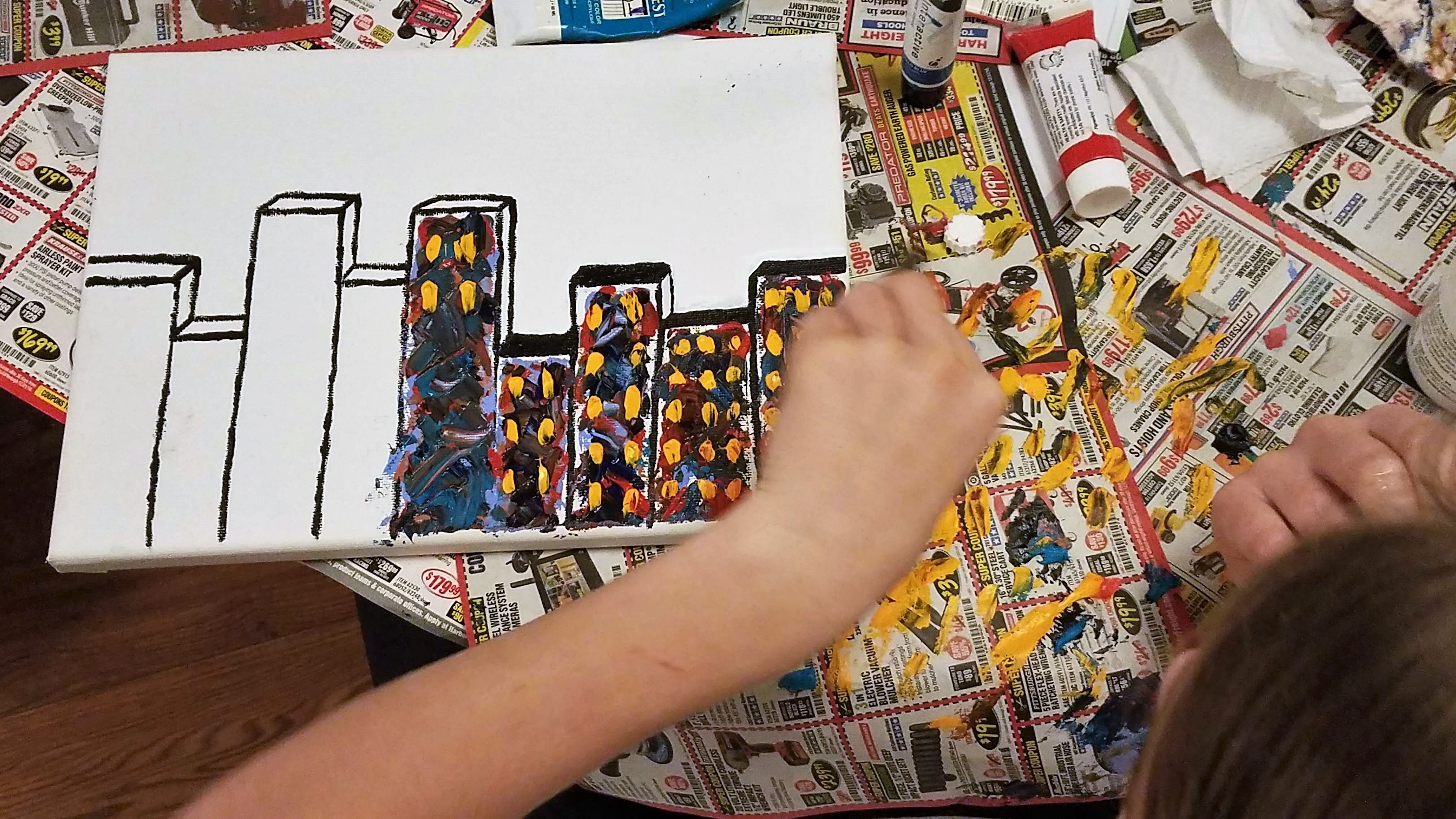My talented nieces lived next door at the time. They came over with their now “tool” box filled of art supplies and we sat down to paint. Here are their paintings.