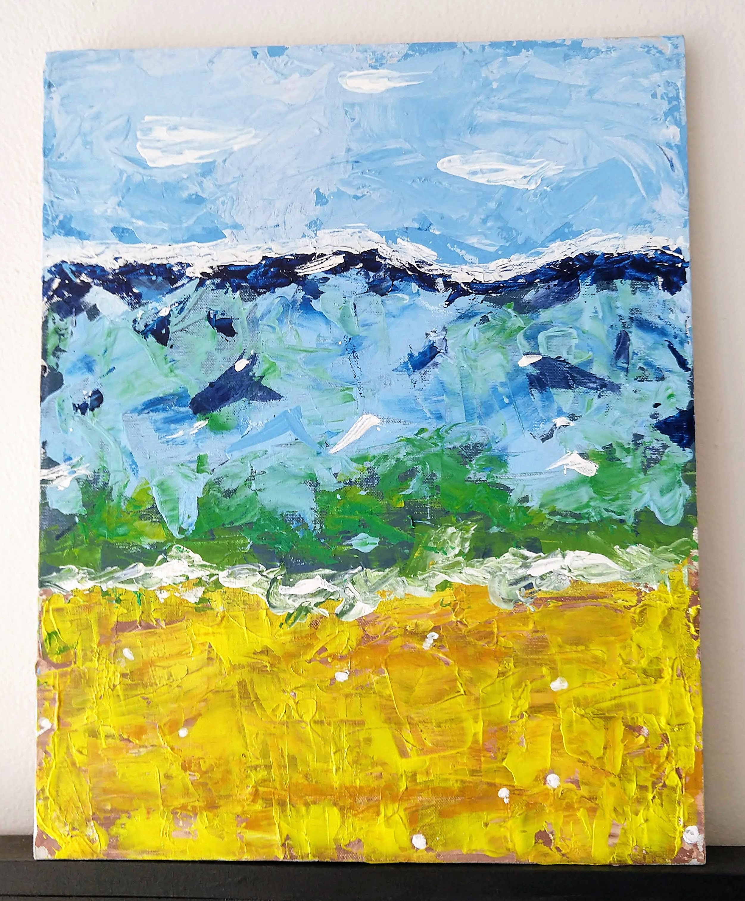 I enjoyed painting so much, I dabbled more. Here is my second acrylic piece. It’s called “Sand, Sea, Sky”, a subject that I have been obsessed with since we move near the beach on a Caribbean island.