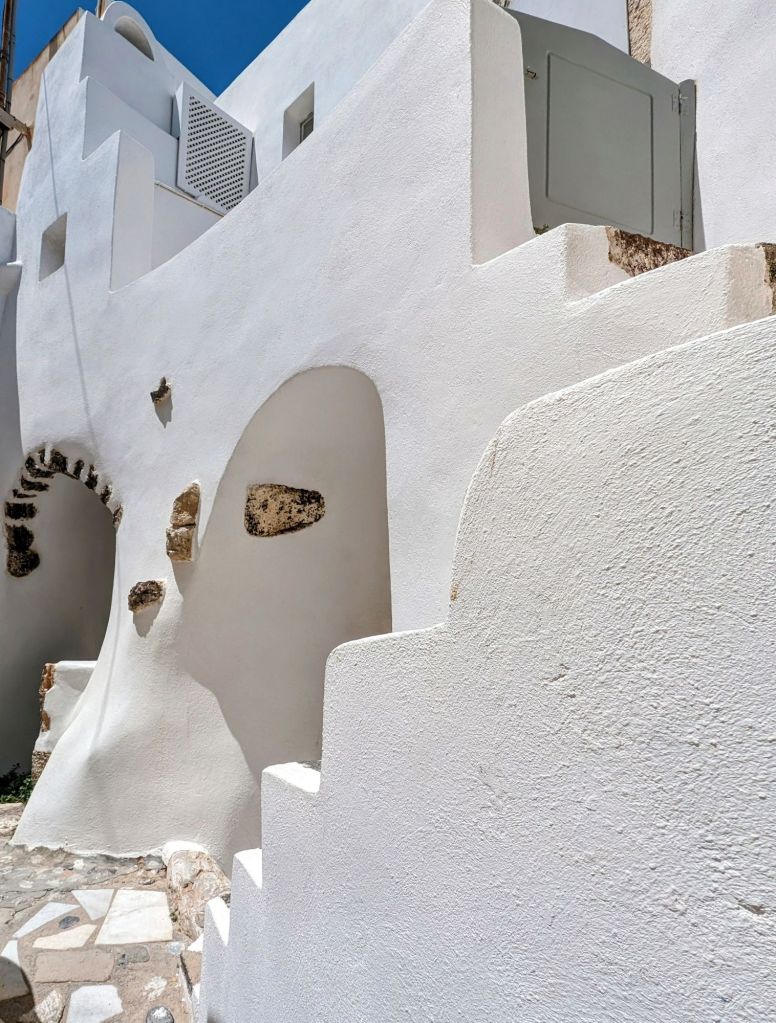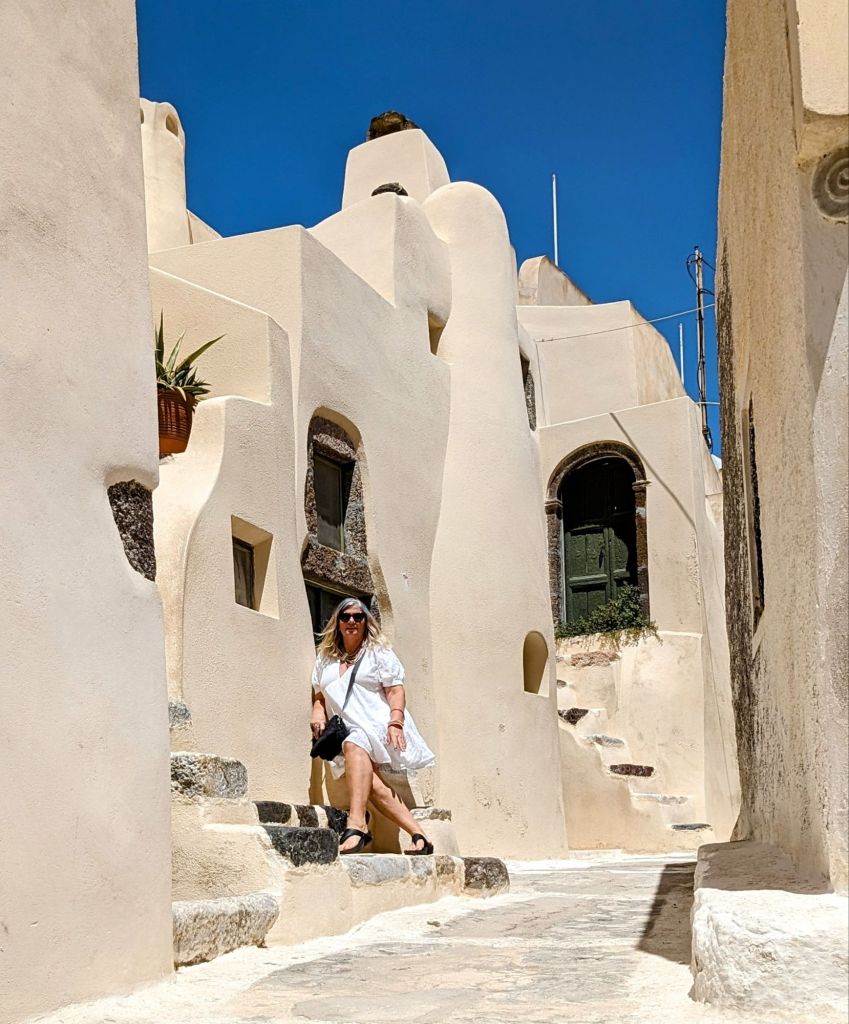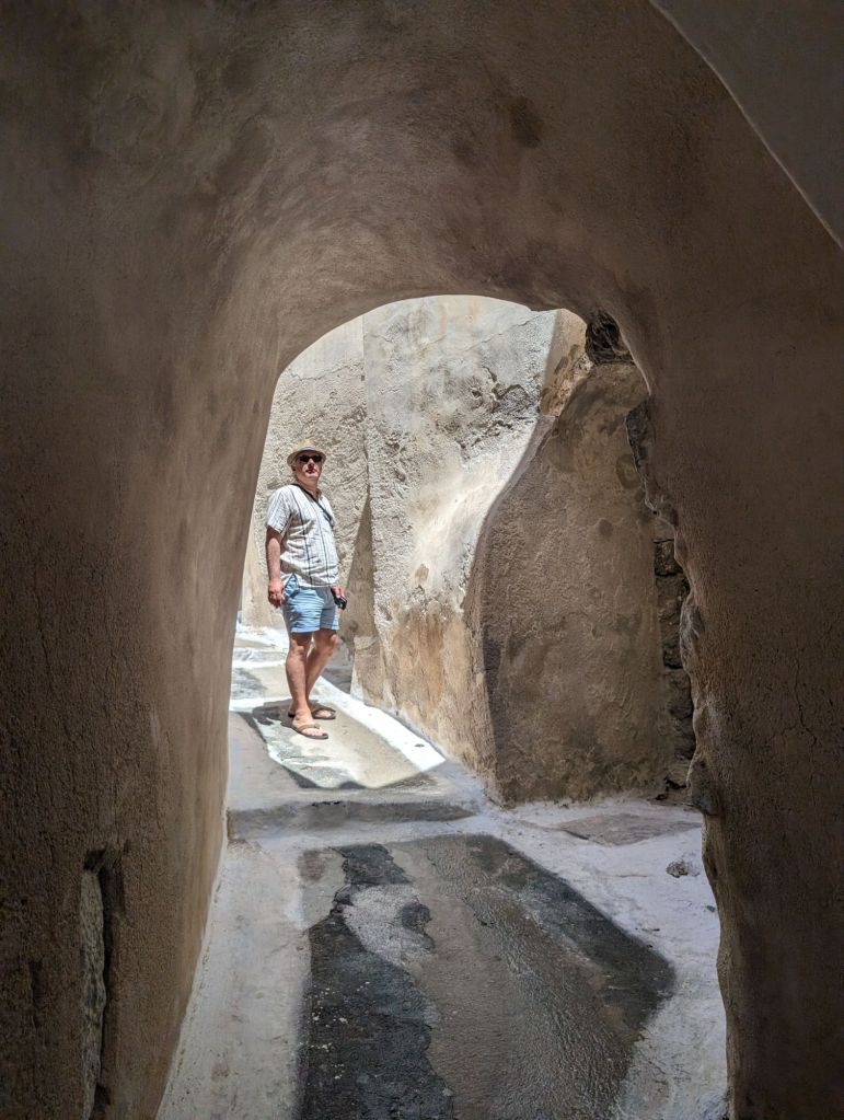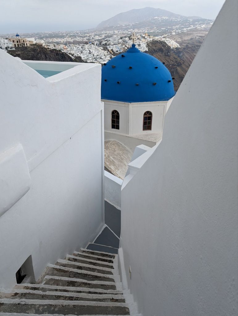 The building decision was amazing too. So although Santorini has plenty of solid ground land to build on, they decided to build down the very high cliffs. And get this…instead of “streets” they decided to have pedestrian only walk ways and alleys that have stairs and curves and turns down the cliffs too.