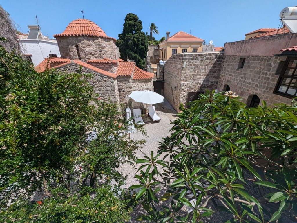 I recommend staying in the medieval part of Rhodes town. Our place, St. Artemois Boutique hotel was more than awesome. Attached to the old, maybe ancient, church St. Artemois. It has only 4-6 rooms only with a pretty courtyard. Made to order Breakfast was in the courtyard and came with our $125. a night fee. Maria is a gracious host too.